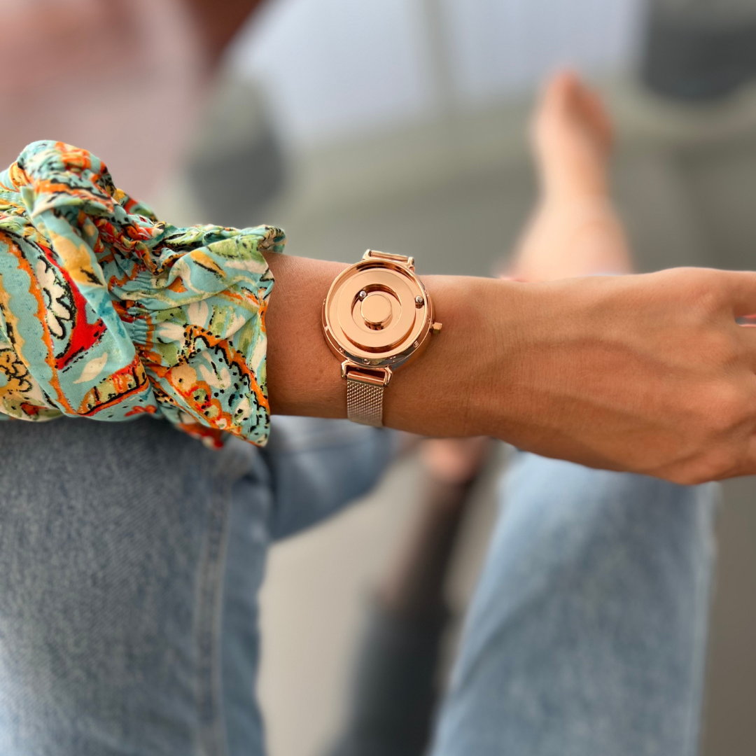 Discover unique watches to stun the world and stop people in their tracks. Inspired by the planet Venus, this watch has a tasteful minimalist and feminine design. Two magic spheres float in orbit to tell you the time. The inner sphere stands for the hour hand, and the outer sphere for the minute hand.